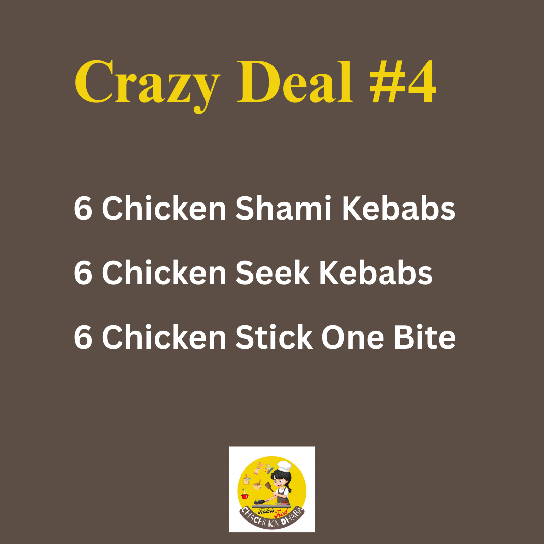 Includes 6 pieces each of Chicken Shami Kebabs, Chicken Seekh Kebabs, and Chicken Stick One Bite — all homemade and frozen for easy cooking.