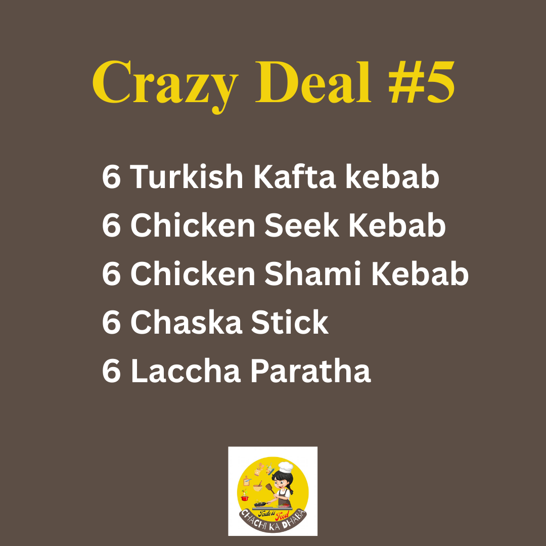 Includes 6 pieces each of Turkish Kafta Kabab, Chicken Seekh Kabab, Chicken Shami Kabab, and Chaska Stick — plus 6 Laccha Parathas. All homemade and frozen.