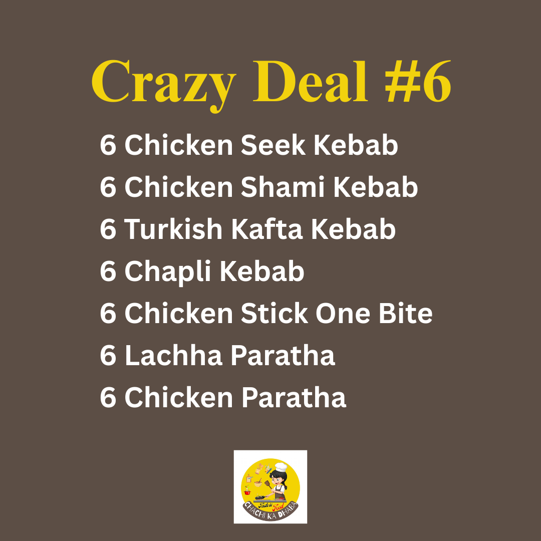 Includes 6 pieces each of Chicken Seekh Kebab, Chicken Shami Kebab, Turkish Kafta Kebab, Chapli Kebab, Chicken Stick One Bite, Lachha Paratha, and Chicken Paratha — all homemade and frozen fresh.