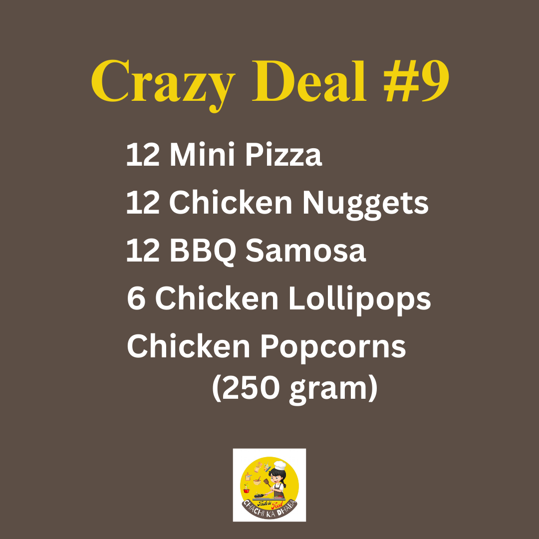 Includes 12 Mini Pizzas, 12 Chicken Nuggets, 12 BBQ Samosas, 6 Chicken Lollipops, and 250g of Chicken Popcorns โ all homemade and frozen for easy serving.